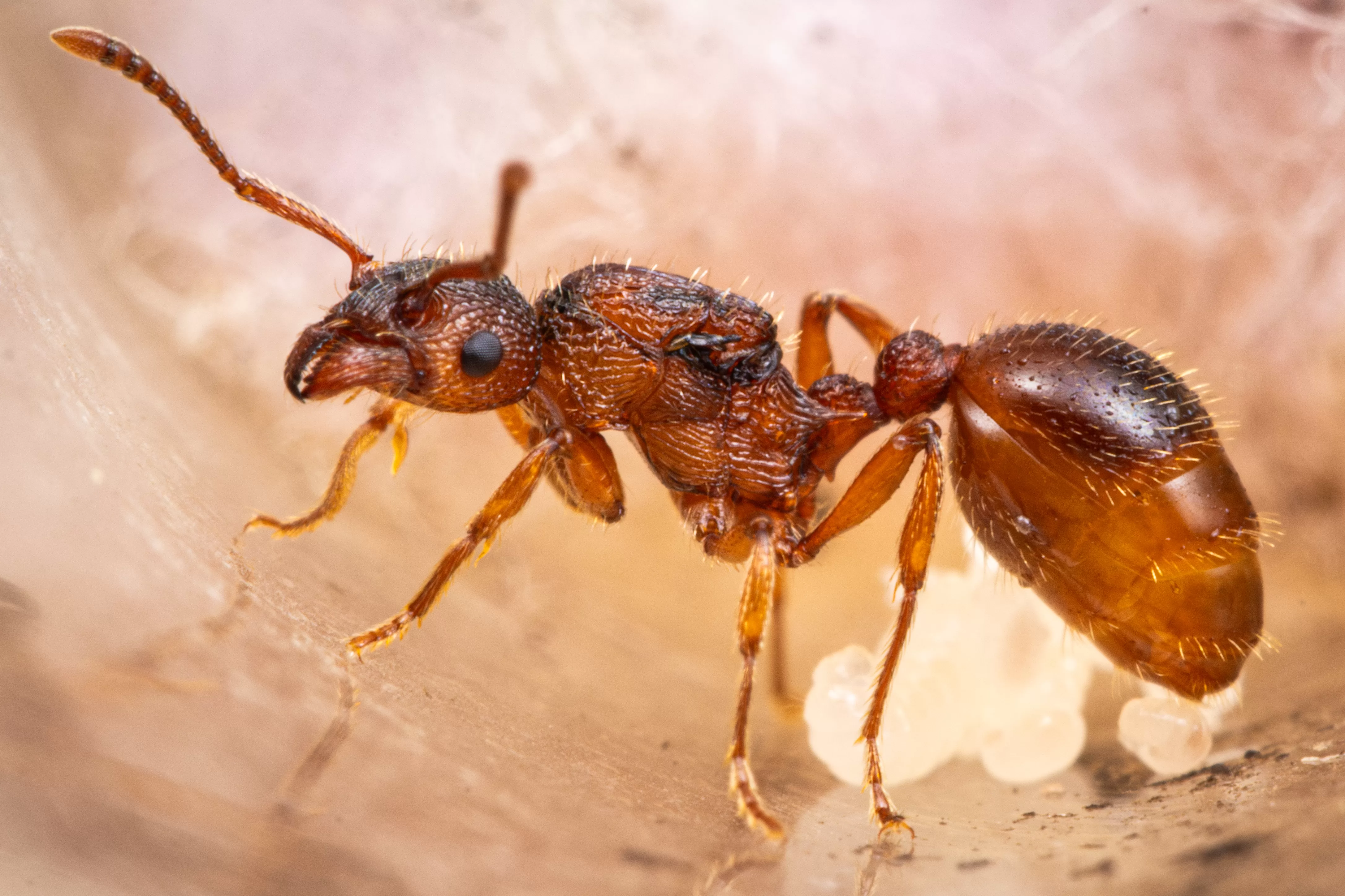 Nesting Habits and Escape Prevention: In the wild, Myrmica evanida is found in open areas, such as fields, parks, and prairies. In captivity, they can thrive in many different nest environments, including acrylic, 3D printed, grout, and ultracal nests. Talcum powder, olive oil, and Fluon can be used to prevent escape.